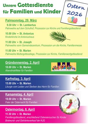 9.30 Uhr St. Lambertus: Palmweihe auf dem Schulhof, anschl. Prozession zur Kirche, dort Familiengottesdienst (R. Gruschka)