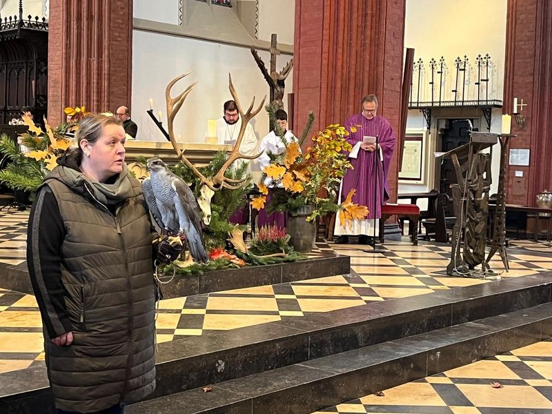 Der Altarraum war von den Jägern besonders gestaltet worden, Falkner hatten ihre Vögel mitgebracht – und auch der Dackel von Birgit Mertens durfte nicht fehlen.