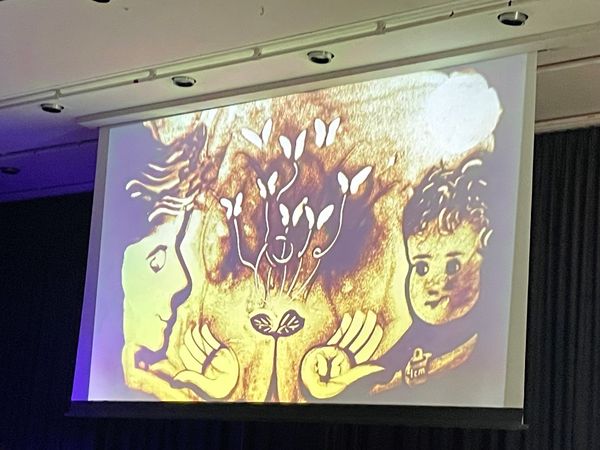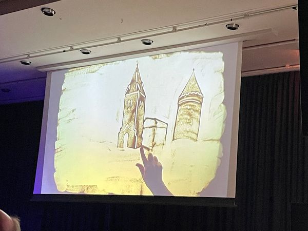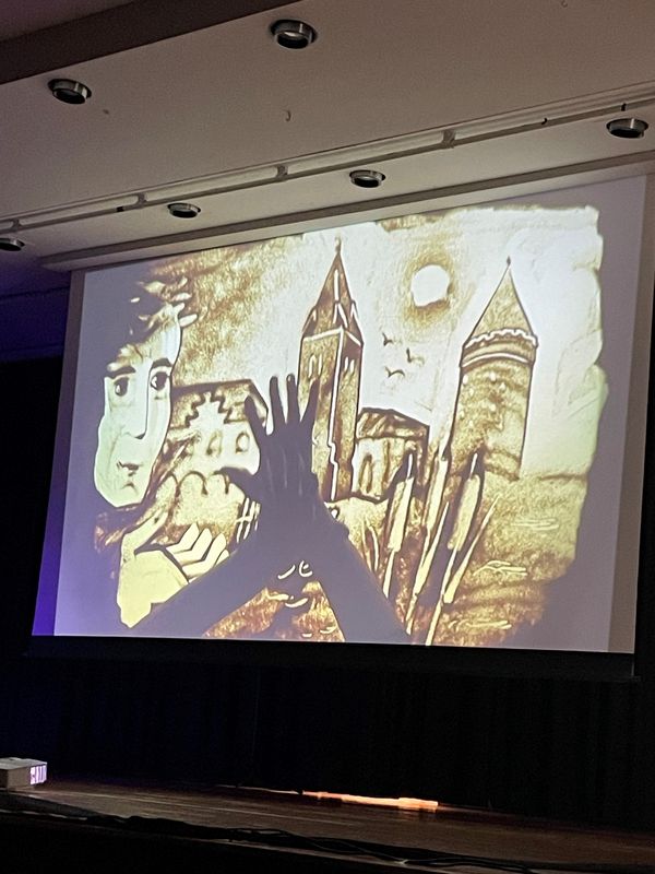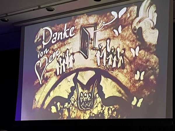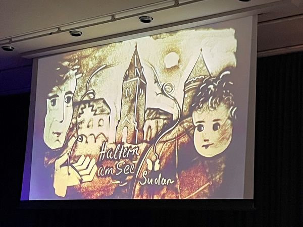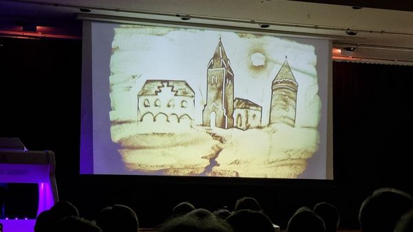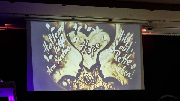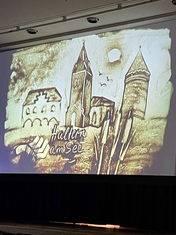 Nach der Pause – mit köstlicher lukullischer Verpflegung durch das Restaurant Rossini – spielte die Musik zunächst auch wieder etwas leiser, die Begeisterung hingegen wurde immer größer: Iryna Bilenka, Weltmeisterin der Sandmalkunst, zauberte auf ihrem Leuchtpult mit unglaublicher Fingerfertigkeit wundervolle, nach und nach dezent ineinander übergehende Kunstwerke. Aus Halterner Bauwerken wurden Gesichter, Pflanzen und Hütten, filigran schattiert und mit immer neuen Schriftzügen versehen – bis zum finalen „Haltern hilft – Sudan“. Atemlose Stille im Publikum – nach der mitreißenden Performance hingegen gab es kein Halten mehr.