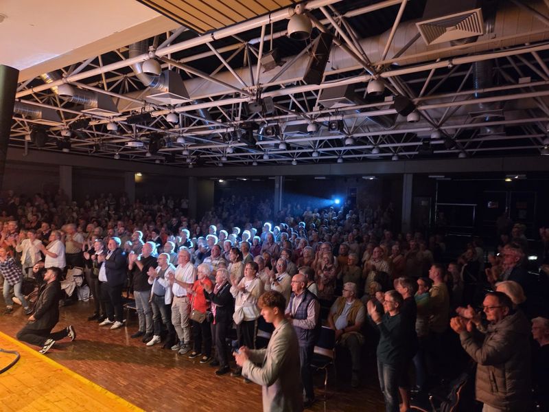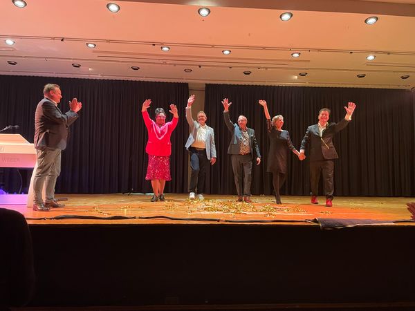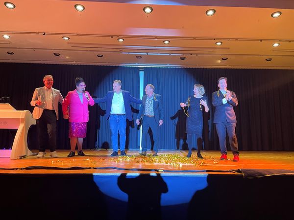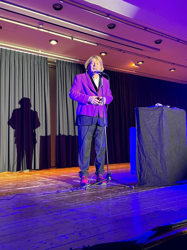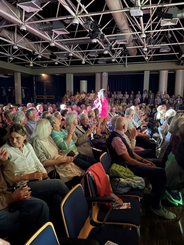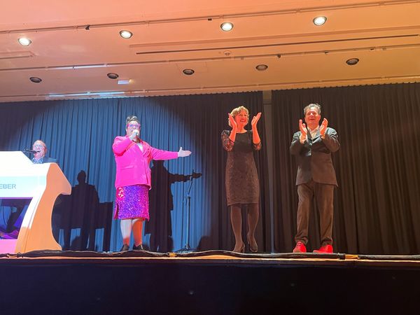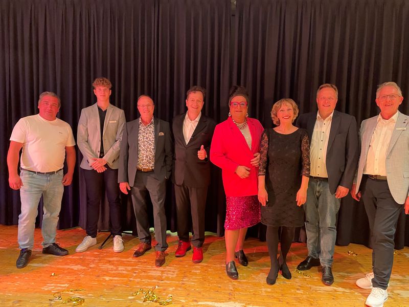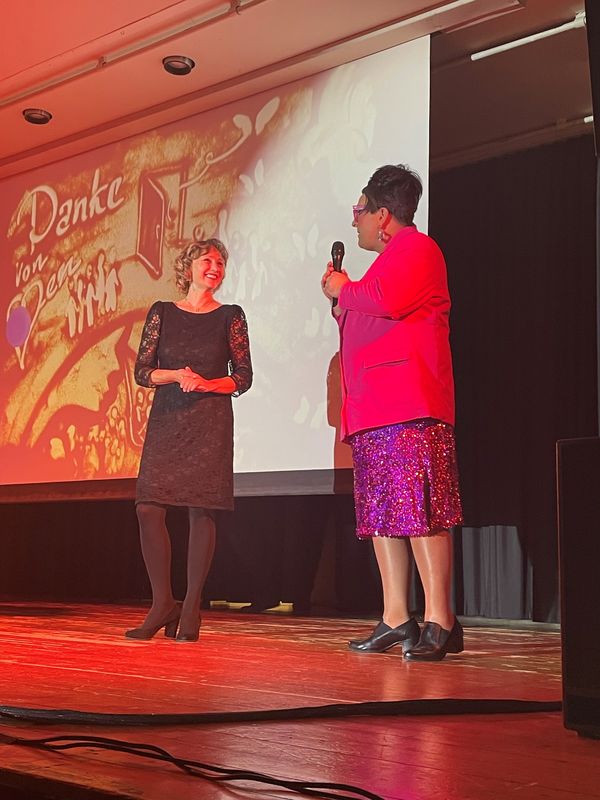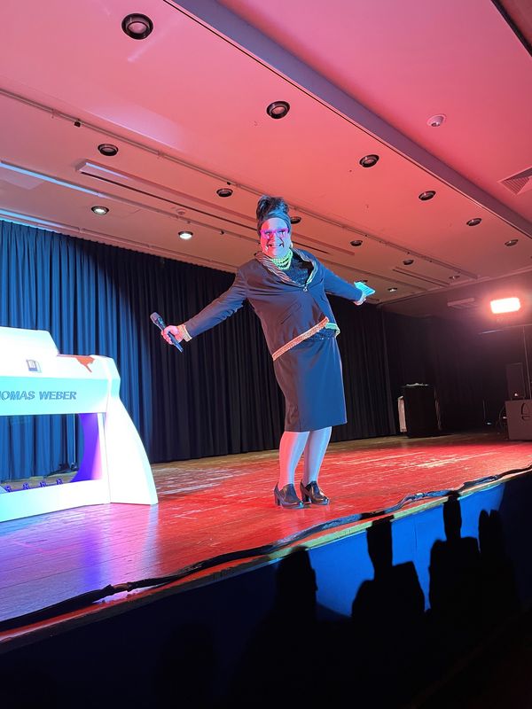 Charmant moderierte „Lotti“ anschließend Jörg Hammerschmidt an, der nun einiges an Prominenz auf die Zuschauer losließ. Als Udo Lindenberg stimmte er „Hinterm Horizont liegt Haltern“ an und als Angela Merkel – natürlich inklusive Finger-Raute – den abgewandelten Beatles-Klassiker „Hey Merz“. Letzterer kam natürlich ebenso zu Wort wie der ehemalige Kanzler („Wie trinkt man einen Scholz-Cocktail? Cum-ex!“) und Karl Lauterbach, während Halterns – natürlich anwesender – Bürgermeister verschont blieb („Über diesen Steg geh ich nicht, Mann!“). Dafür erfüllte Hammerschmidt einen persönlichen Synchro-Wunsch von Lieselotte Lotterleben: Inge Meysel, natürlich standesgemäß mit rotem Riesenhut. Das Publikum tobte.