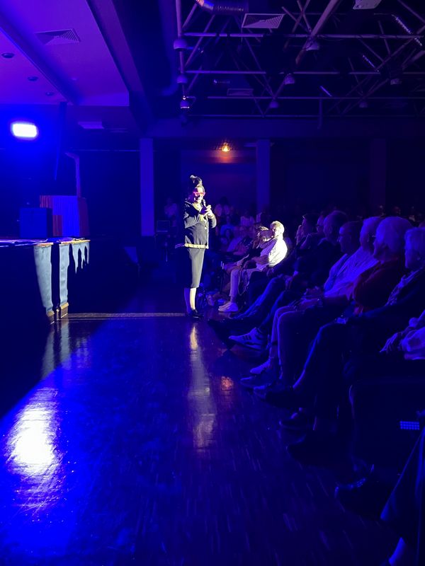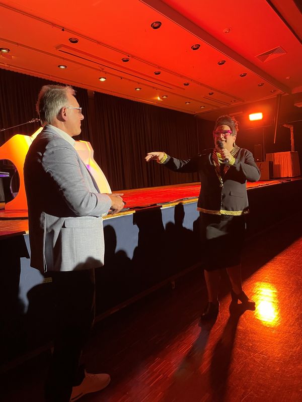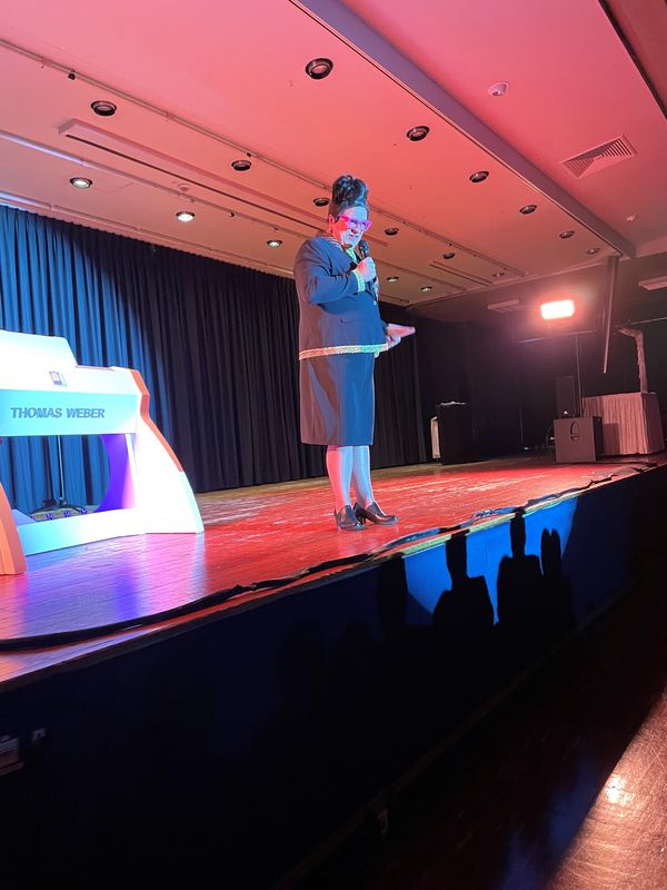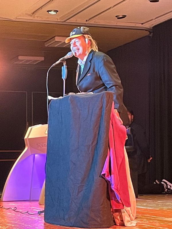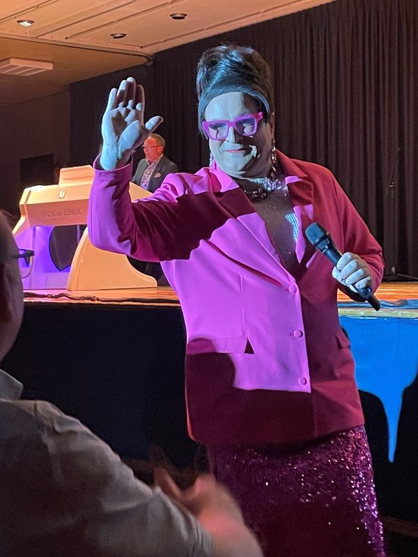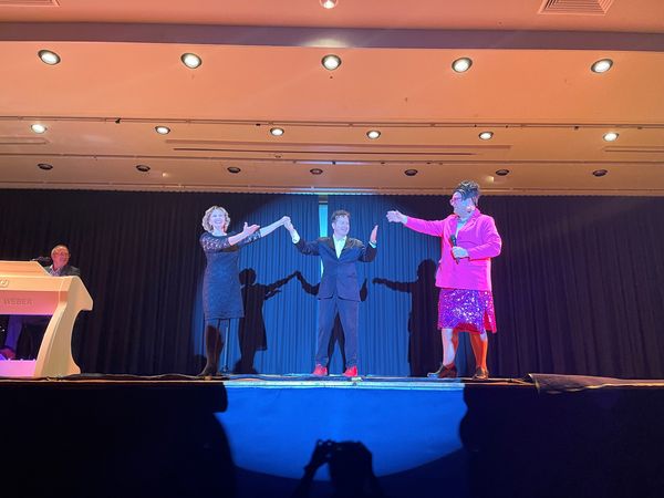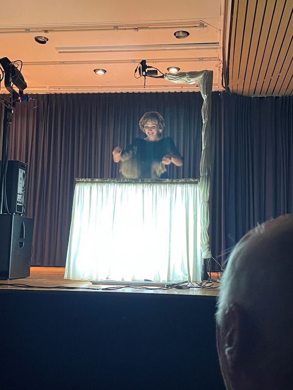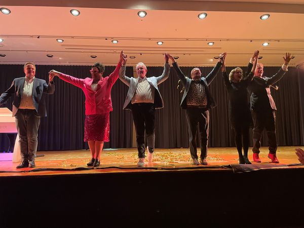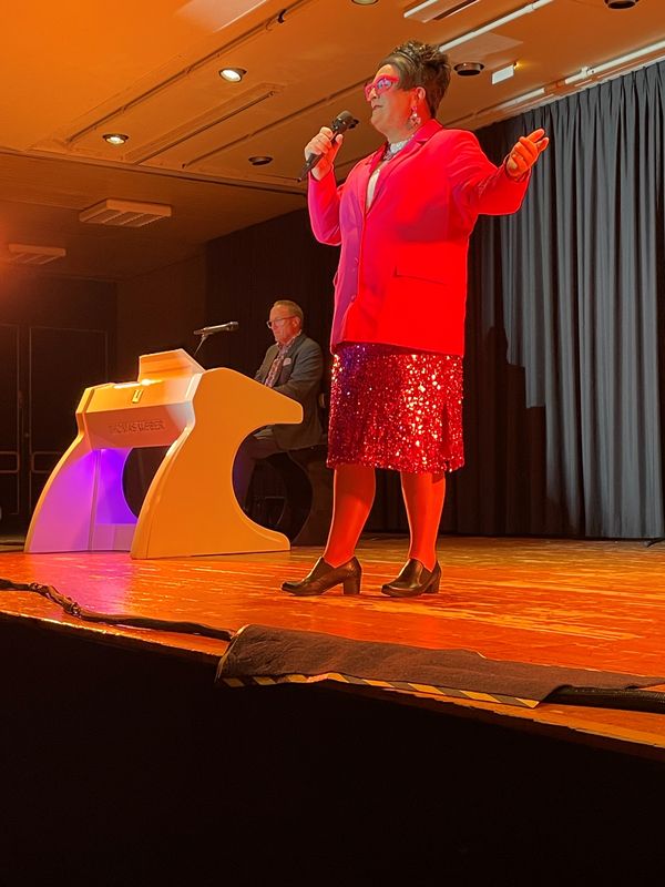 Charmant moderierte „Lotti“ anschließend Jörg Hammerschmidt an, der nun einiges an Prominenz auf die Zuschauer losließ. Als Udo Lindenberg stimmte er „Hinterm Horizont liegt Haltern“ an und als Angela Merkel – natürlich inklusive Finger-Raute – den abgewandelten Beatles-Klassiker „Hey Merz“. Letzterer kam natürlich ebenso zu Wort wie der ehemalige Kanzler („Wie trinkt man einen Scholz-Cocktail? Cum-ex!“) und Karl Lauterbach, während Halterns – natürlich anwesender – Bürgermeister verschont blieb („Über diesen Steg geh ich nicht, Mann!“). Dafür erfüllte Hammerschmidt einen persönlichen Synchro-Wunsch von Lieselotte Lotterleben: Inge Meysel, natürlich standesgemäß mit rotem Riesenhut. Das Publikum tobte.