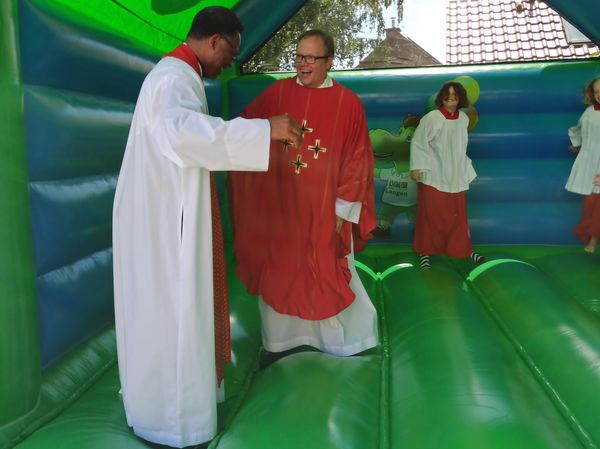 Ein runder Geburtstag stand am 29. Juni an: Unsere Kirche St. Marien wurde 60 Jahre alt! Das Jubiläum wurde mit einem feierlichen Gottesdienst und einem bunten Fest rund um die Kirche ordentlich gefeiert. Ein Höhepunkt war dabei die Kindershow „Knallvergnügt“ mit Daniel Kallauch. Und was die Anwesenden ganz besonders freute: Unser ehemaliger Pfarrer Francis Nwosu stattete „seiner“ ehemaligen Gemeinde ebenfalls einen Geburtstagsbesuch ab!