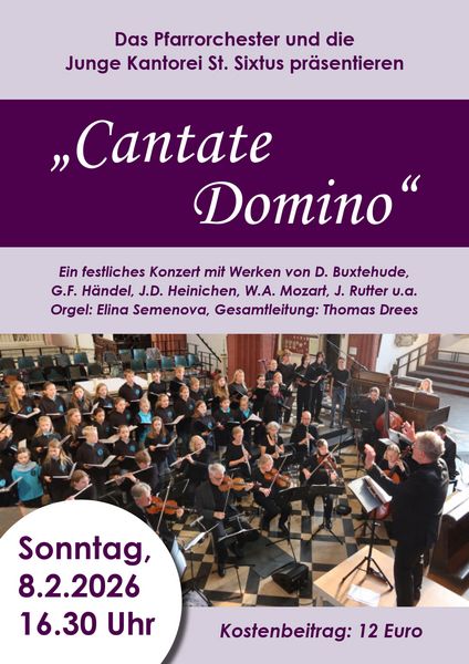 Am Sonntag, 8. Februar, um 16.30 Uhr erwartet Sie ein festliches Konzert mit dem Pfarrorchester, der Jungen Kantorei St. Sixtus sowie Elina Semenova an der Orgel in der Annabergkirche.
