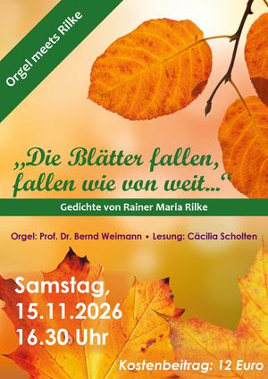 Die Orgelimprovisationen werden von Prof. Dr. Bernd Weimann (Dülmen) vorgetragen, die Gedichte trägt Cäcilia Scholten vor.