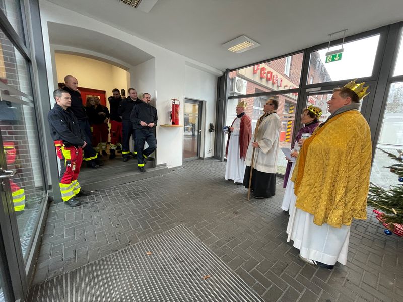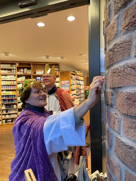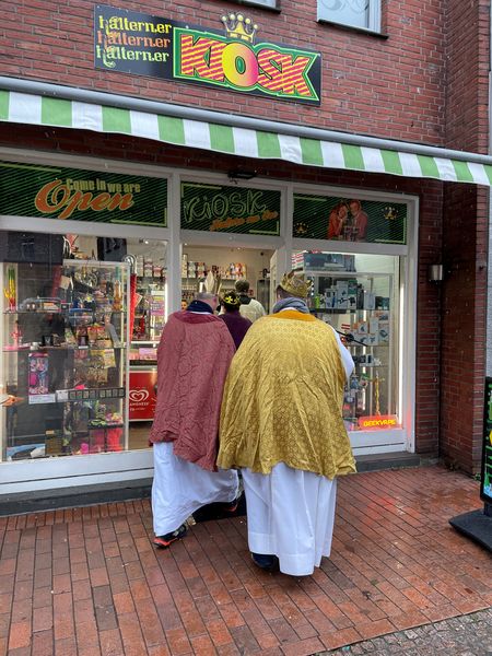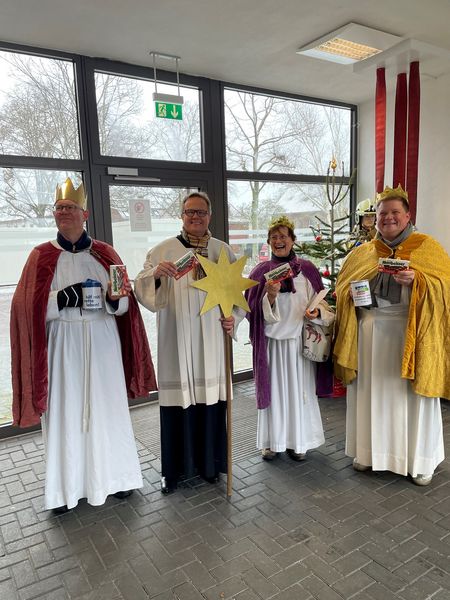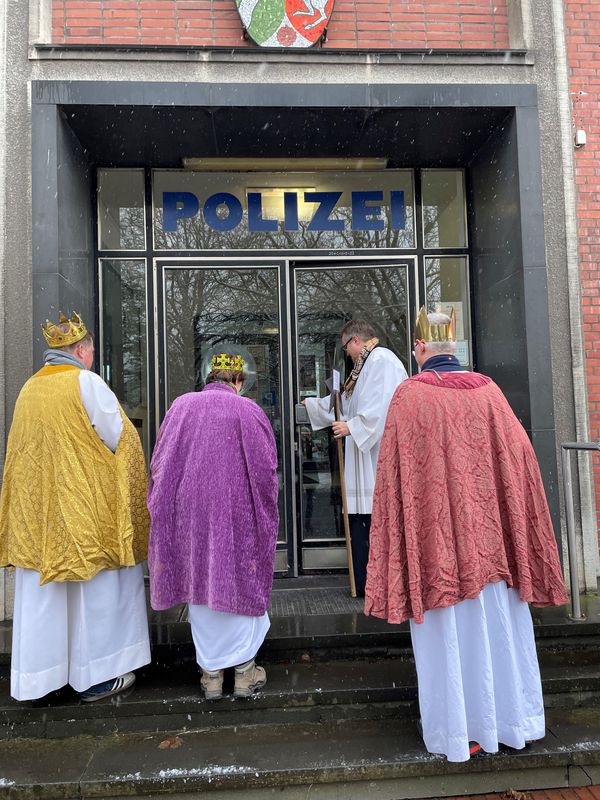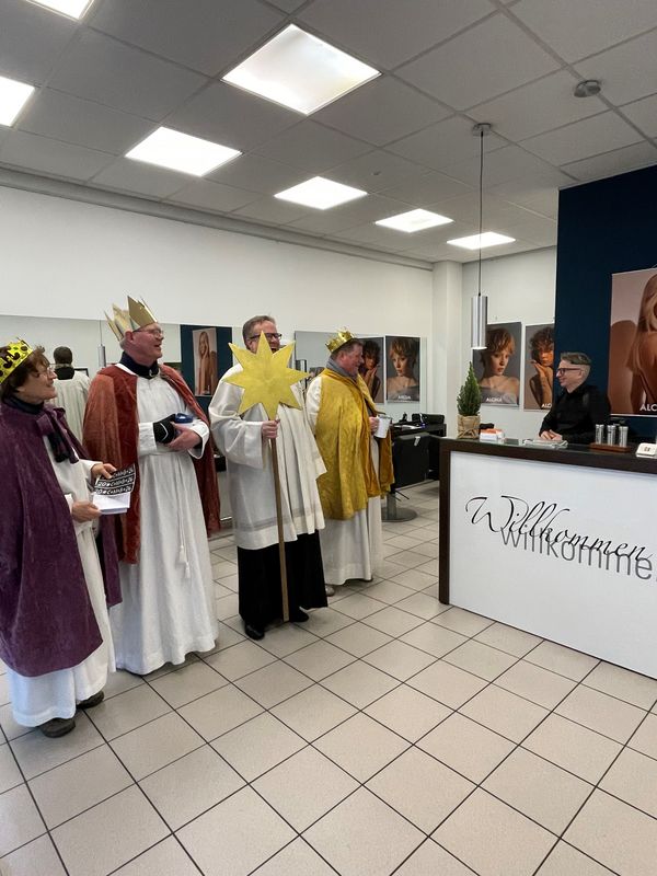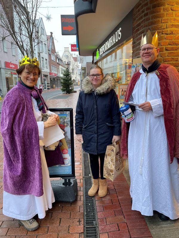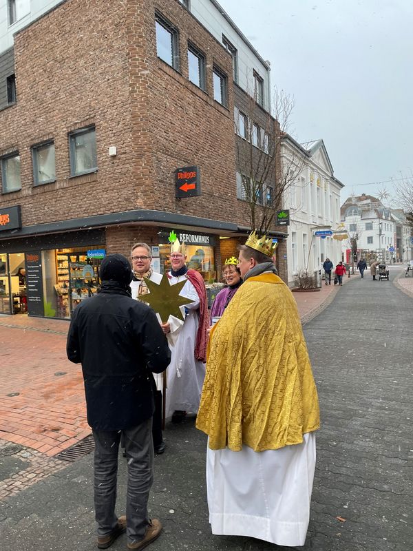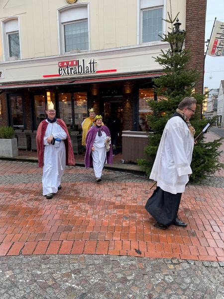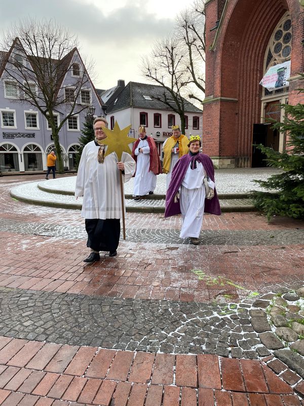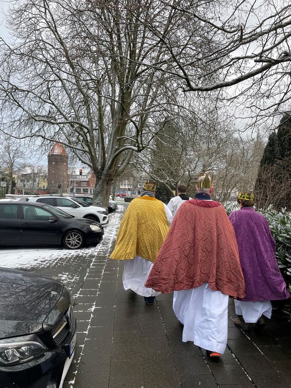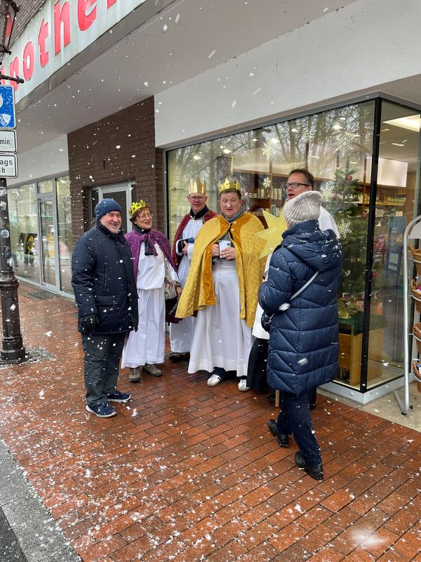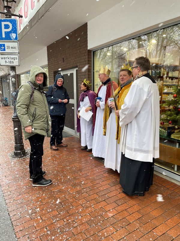 Natürlich zogen in diesem Jahr auch sie wieder durch Halterns Innenstadt, unsere "großen" Sternsinger alias Andreas Stegemann Reinhild Tuschewitzki, Claudius Gesterkamp und - diesmal "ungekrönt", weil "geistlicher Begleiter" - Michael Ostholthoff. Bei winterlichen Temperaturen und begleitet von so macnher Schneeflocke, beehrte das Quartett Geschäftsleute, Feuerwehr und Polizei und spendete gern auch spontan auf der Straße den gesungenen Segen. Die Halterner freuten sich sichtlich und gaben gern und großzügig für die Kinder in aller Welt - am Ende konnten die vier "Großen" rund 2100 Euro aus ihren Spendendosen holen. Dafür einen ganz herzlichen Dank!