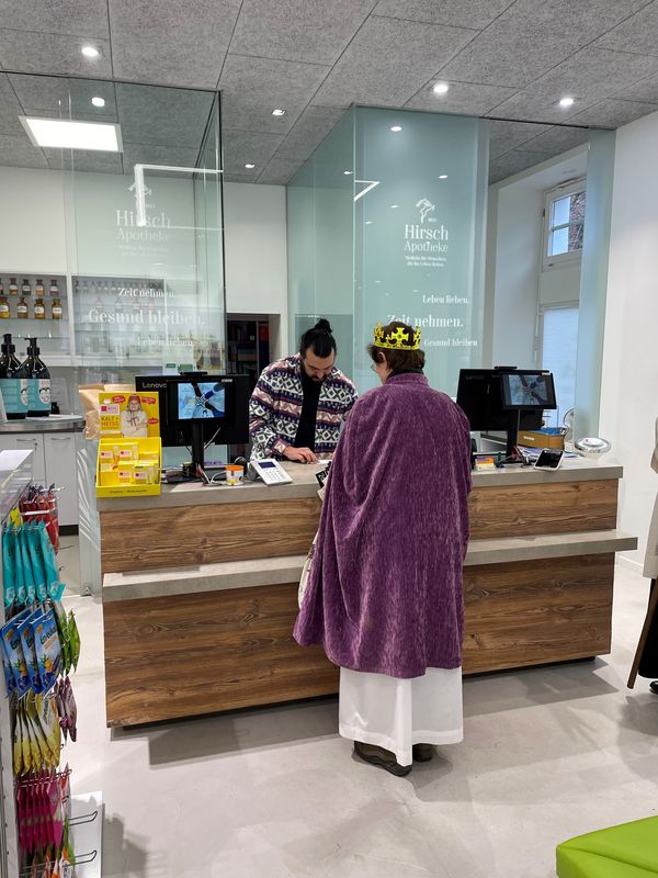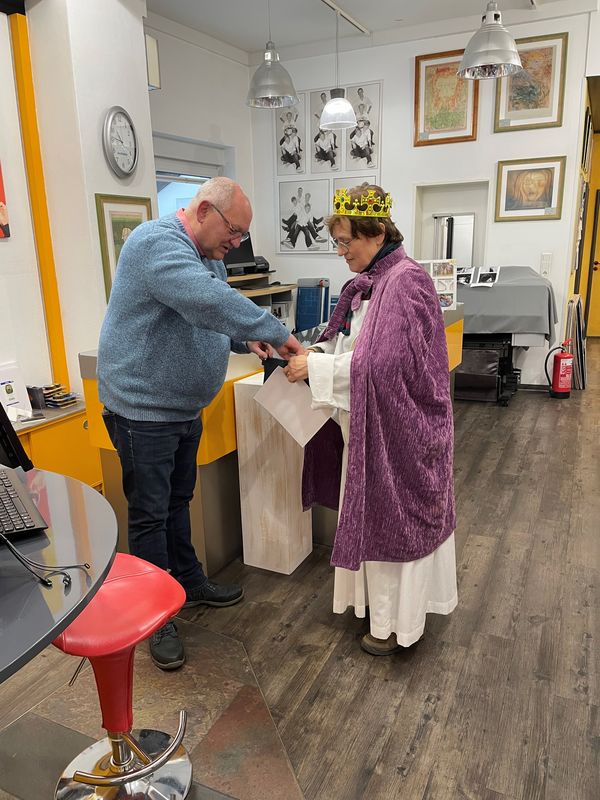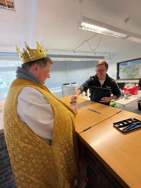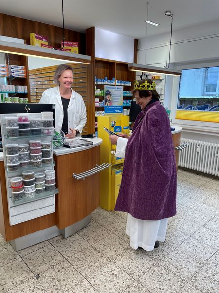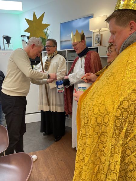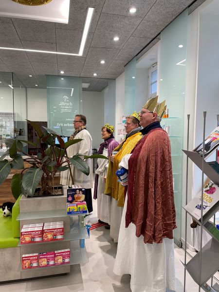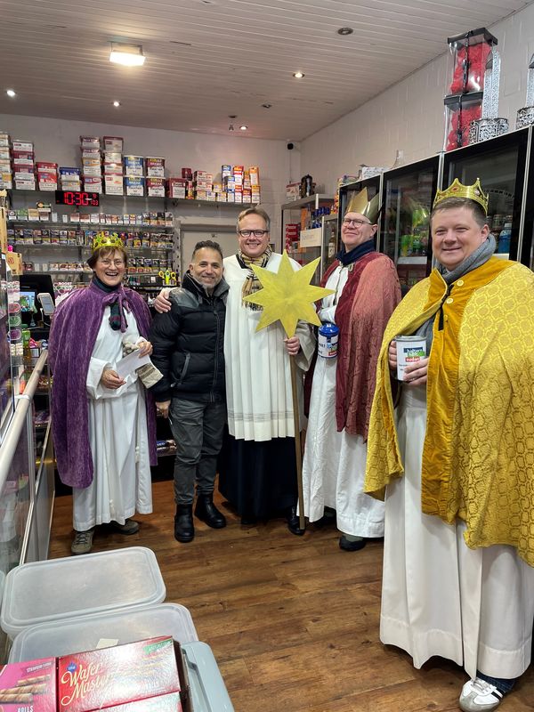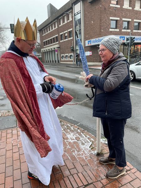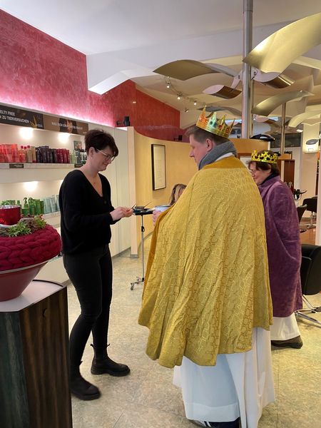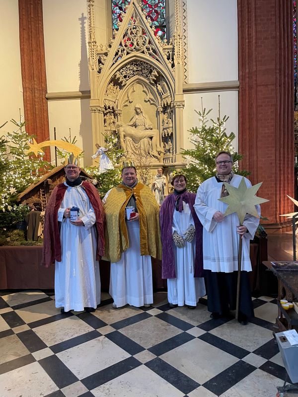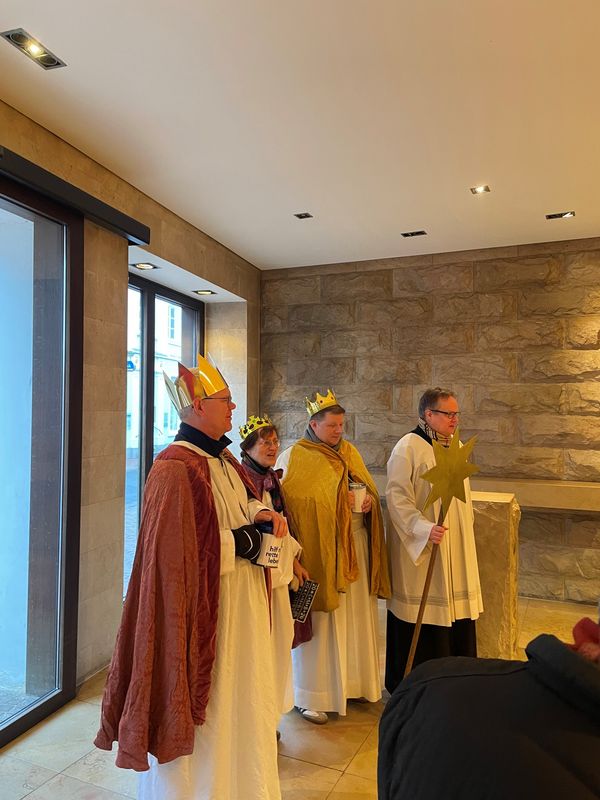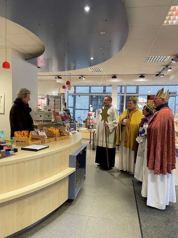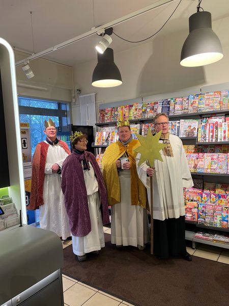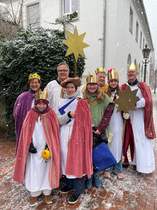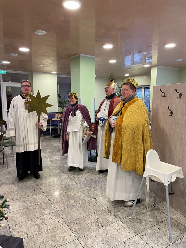 Natürlich zogen in diesem Jahr auch sie wieder durch Halterns Innenstadt, unsere "großen" Sternsinger alias Andreas Stegemann Reinhild Tuschewitzki, Claudius Gesterkamp und - diesmal "ungekrönt", weil "geistlicher Begleiter" - Michael Ostholthoff. Bei winterlichen Temperaturen und begleitet von so macnher Schneeflocke, beehrte das Quartett Geschäftsleute, Feuerwehr und Polizei und spendete gern auch spontan auf der Straße den gesungenen Segen. Die Halterner freuten sich sichtlich und gaben gern und großzügig für die Kinder in aller Welt - am Ende konnten die vier "Großen" rund 2100 Euro aus ihren Spendendosen holen. Dafür einen ganz herzlichen Dank!